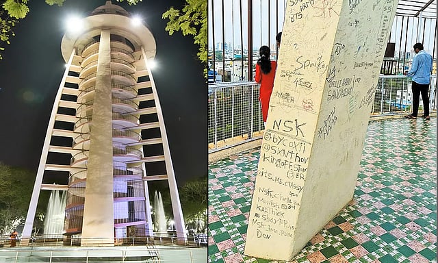 இதனால் மிகவும் நேர்த்தியாக புதுப்பொலிவுடன் திறக்கப்பட்ட கோபுரம், தற்போது கோபுரத்தின் தூண்களில் பெயரை எழுதி வைத்து அலங்கோலமாக காட்சியளிக்கிறது.