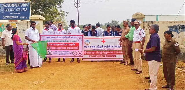 அரியலூர் மாவட்டம் ஜெயங்கொண்டம் அரசு கலை மற்றும் அறிவியல் கல்லூரியில் இளைஞர் செஞ்சிலுவை சங்கம் சார்பில் நடைபெற்ற போதைப் பொருளுக்கு எதிரான விழிப்புணர்வு பேரணியை எம்.எல்.ஏ. கண்ணன் துவக்கி வைத்தார்.பேரணிக்கு கல்லூரி முதல்வர் கலைச்செல்வி தலைமை வகித்து பேசினார். பேரணியானது கல்லூரியில் துவங்கி அண்ணா சிலை, நான்கு ரோடு, பேருந்து நிலையம் உள்ளிட்ட முக்கிய வீதிகள் வழியாக சென்று மீண்டும் கல்லூரியில் முடிவடைந்தது.முன்னதாக போதைப் பொருள் ஒழிப்பு குறித்து வாசகங்களை எம்.எல்.ஏ. வாசிக்க பின் தொடர்ந்து மாணவ, மாணவிகள், பேராசிரியர்கள் வாசித்து உறுதி மொழியை ஏற்றுக்கொண்டனர். போதைப் பொருட்களால் ஏற்படும் விளைவுகள் சமூகத்தில் சில குடும்பங்கள் படும் அல்லல்கள் போன்றவற்றைப் பற்றி மாணவர்களுக்கு எடுத்துரைக்கப்பட்டது. கல்லூரி பேராசிரியர்கள் தமிழ்த்துறை வடிவேல், கணினி துறை கார்த்திகேயன், வணிகவியல் துறை சக்திமுருகன் மற்றும் அனைத்து துறைத்தலைவர்கள் பேராசிரியர்கள், போக்குவரத்து காவல் உதவி ஆய்வாளர் தங்கமணி உள்ளிட்ட போலீசார் மாணவ, மாணவிகள் பலரும் கலந்துகொண்டனர். இறுதியில் கல்லூரி செஞ்சிலுவை சங்க திட்ட அலுவலர் வடிவேலன் நன்றி கூறினார்.