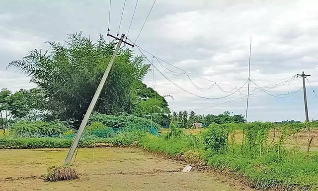 இங்கு ஆயிரத்திற்கும் மேற்பட்ட ஏக்கரில் விளைநிலங்கள் உள்ளன. இந்த விளைநிலங்களின் வழியாக செல்லும் மின்கம்பம் ஒன்று சாய்ந்த நிலையில் உள்ளது.