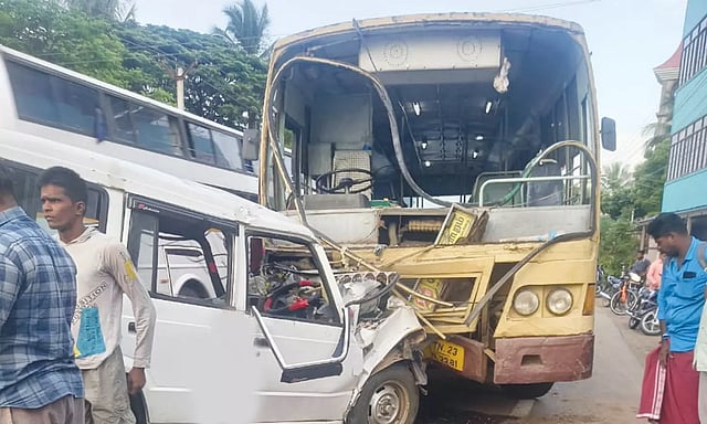 ஆரல்வாய்மொழி அருகே நாகர்கோவில்-திருநெல்வேலி தேசிய நெடுஞ்சாலையில் உள்ள வெள்ளமடம் பகுதியில் வளைவான சாலையில் கார் வந்தபோது, டிரைவரின் கட்டுப்பாட்டை இழந்து தாறுமாறாக ஓடியது. காருக்குள் இருந்தவர்கள் என்ன நடக்கிறது என்பதை உணர்வதற்கு முன்பே கார் எதிர்திசை நோக்கி பாய்ந்துள்ளது. அப்போது அங்கு நாகர்கோவில் அண்ணா பஸ் நிலையத்தில் இருந்து ரோஸ்மியாபுரம் செல்லும் அரசு டவுன் பஸ் வந்து கொண்டிருந்தது. அந்த பஸ் மீது, கட்டுப்பாட்டை இழந்து சென்ற கார் நேருக்கு நேர் மோதியது.