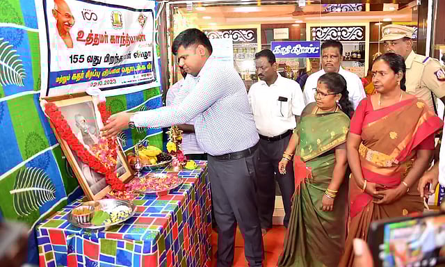 காந்தி பிறந்த நாளையொட்டி மாவட்ட கலெக்டர் அலுவலகம், அனைத்து ஊராட்சி ஒன்றிய அலுவலகங்கள், நகராட்சி கள், பேரூராட்சிகள், அரசு மருத்துவமனை வளாகங்களில் தற்காலிக கதர் விற்பனை நிலையங்கள் இன்று முதல் தீபாவளி முடியும் வரை செயல்படும். மேலும், தரமிக்க அசல் வெள்ளி ஜரிகையினால் ஆன பட்டு சேலைகள், கதர் வேஷ்டிகள், துண்டு ரகங்கள், ரெடிமேட் சட்டைகள், மெத்தை, தலையணைகள், கண்கவரும் கதர் பட்டு ரகங்கள் மற்றும் உல்லன் ஆகிய ரகங்களும், சுத்தமான அக்மார்க் தேனி, குளியல் சோப்பு, சாம்பிராணி, பூஜைப் பொருட்கள், பனைவெல்லம் மற்றும் பணை பொருட்களும் விற்பனை செய்யப்பட்டு வருகிறது.