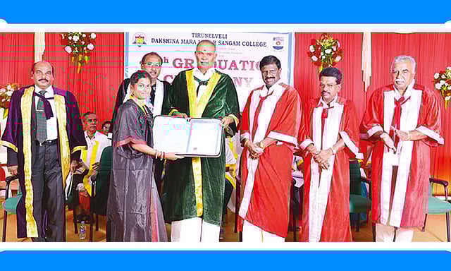 வள்ளியூர் அருகே தெற்கு கள்ளிகுளத்தில் உள்ள நெல்லை தட்சணமாற நாடார் சங்க கல்லூரியின் 46-வது பட்டமளிப்பு விழா, கல்லூரி வளாகத்தில் உள்ள பத்மஸ்ரீ டாக்டர் பா.சிவந்தி ஆதித்தனார் மாணவர் அரங்கில் நேற்று நடந்தது. கல்லூரி செயலாளர் ராமநாதன் நாடார், தலைவர் காளிதாஸ் நாடார், பொருளாளர் செல்வராஜ் நாடார், நெல்லை தட்சணமாற நாடார் சங்க செயலாளர் ராஜகுமார் நாடார் ஆகியோர் முன்னிலை வகித்தனர். கல்லூரி முதல்–வர் ராஜன் ஆண்டறிக்கை வாசித்தார்.