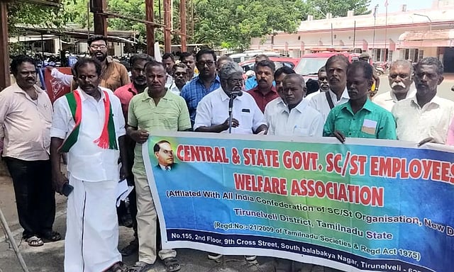 மணிப்பூர் மாநிலத்தில் பழங்குடி மக்கள் மீது நடத்தப்பட்ட கொலைவெறி தாக்குதலை கண்டித்து மத்திய- மாநில அரசின் எஸ்.சி., எஸ்.டி. ஊழியர்கள் நலச்சங்கம் நெல்லை மாவட்ட கிளை சார்பில் இன்று சந்திப்பு ரெயில் நிலையம் முன்பு கண்டன ஆர்ப்பாட்டம் நடைபெற்றது.
