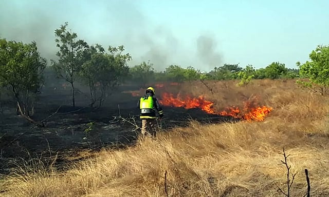 சென்னிமலை அருகே உலகபுரம் பகுதியில் தனியாருக்கு சொந்தமான நிலத்தில் உள்ள வறண்டு கிடந்த புற்களில் திடீரென தீ பிடித்தது.