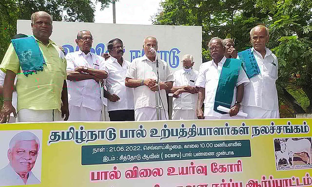 மாவட்ட தலைவர் ராஜு தலைமையில் நடைபெற்ற இந்த ஆர்ப்பாட்டத்தில் ஒரு லிட்டர் பசும் பாலுக்கு விலை ரூ. 42 ஆகவும், எருமைப் பாலுக்கு ரூ. 51 ஆகவும் ஆவின் பால் உற்பத்தியாளர்களுக்கு கொள்முதல் விலையை உயர்வு வழங்கிட வேண்டும்.