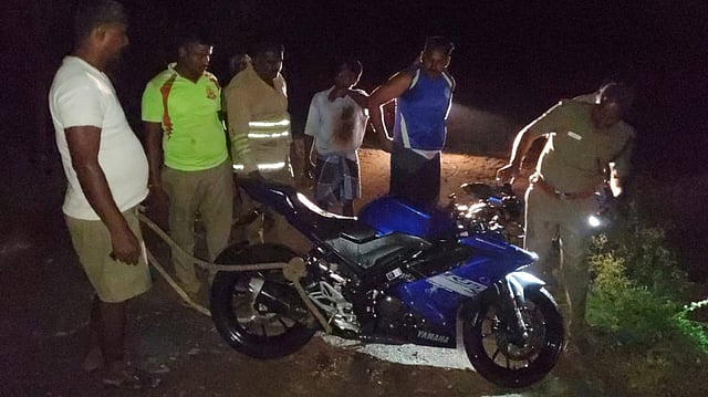 நேற்று இரவு இவர் தனது நண்பரை மோட்டார் சைக்கிளில் அழைத்துக் கொண்டு தாளக்கொம்பு–புதூர் பகுதியில் உள்ள அவரது வீட்டிற்கு சென்றார். பின்னர் அவரை இறக்கி விட்டு விட்டு மீண்டும் கோபிசெட்டிபாளையம் நோக்கி வந்து கொண்டு இருந்தார்.