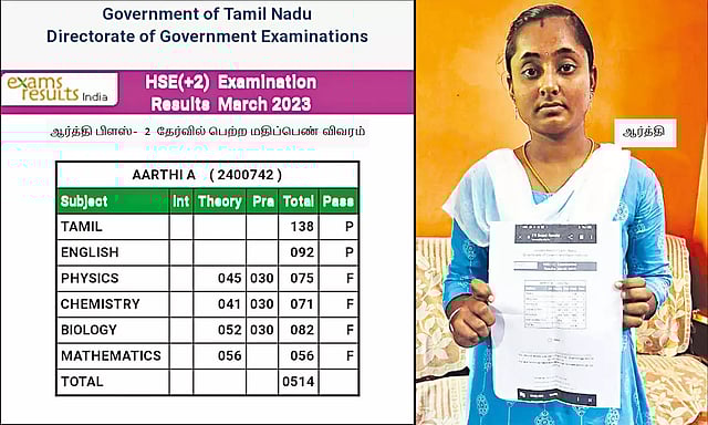 அப்போது தமிழில் 100-க்கு 138 மதிப்பெண் என்று பட்டியலில் அச்சிடப்பட்டு இருந்தது. மேலும் மதிப்பெண் பட்டியலில் ஆங்கில பாடத்தில் 100-க்கு 92, கணிதத்தில் 56, இயற்பியலில் 75, வேதியியலில் 71, உயிரியலில் 82 என்று தேர்ச்சி மதிப்பெண்கள் பெற்று இருந்தார். மொத்த மதிப்பெண்ணாக 600-க்கு 514 என்றும் குறிப்பிடப்பட்டு இருந்தது. ஆனால், இயற்பியல், வேதியியல், உயிரியல், கணிதம் என 4 பாடங்களில் அவர் தேர்ச்சி பெறவில்லை எனவும் குறிப்பிடப்பட்டு இருந்தது. இது மாணவியை மட்டுமல்ல அவருடைய குடும்பத்தினர் அனைவரையும் அதிர்ச்சிக்கு உள்ளாக்கி இருக்கிறது.