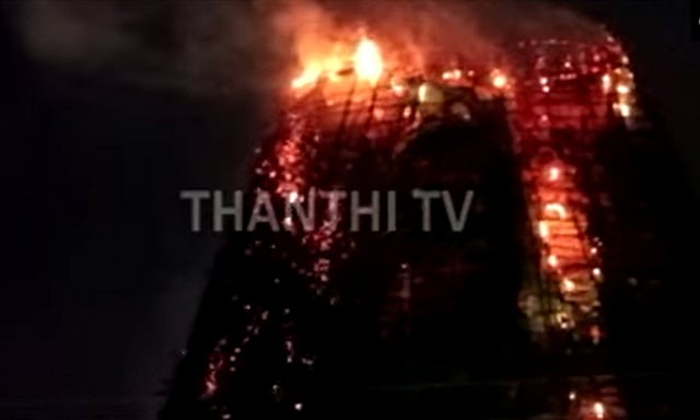சிவகாசியில் உள்ள பத்ரகாளியம்மன் கோயிலில் திருப்பணிகள் நடைபெற்று வந்தன. ராஜகோபுரத்திற்கு வர்ணம் தீட்டுவதற்காக கம்புகள் கட்டி சாரம் அமைக்கப்பட்டிருந்தது. மேலும் சாக்கு துணிகளால் ராஜகோபுரம் முழுவதும் மூடப்பட்டிருந்தது. இந்நிலையில் அந்த பகுதியில் திருமண நிகழ்ச்சி ஊர்வலம் நடைபெற்றது. அப்போது அந்த கூட்டத்தில் இருந்த சிலர் பேன்சி ரக பட்டாசு வெடித்தப் போது அதில் இருந்து வெளிவந்த தீப்பொறி கோயில் சாரத்தின் மீது சுற்றப்பட்டிருந்த சாக்கில் பட்டு தீப்பிடித்தது.
