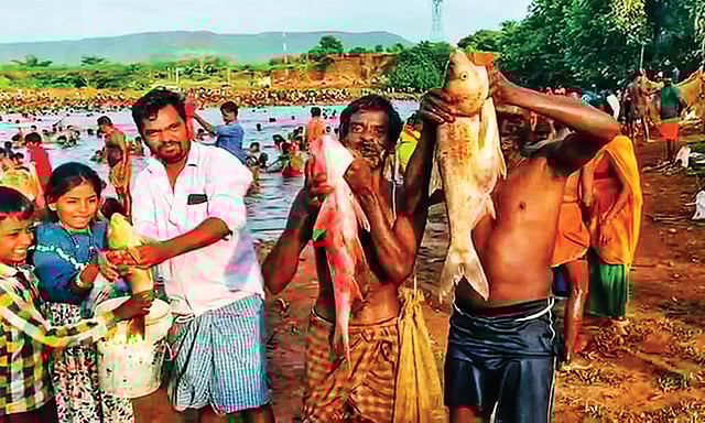 இதில் கட்லா, ஜிலேபி, கெளுத்தி, கெண்டை, பாறை உள்ளிட்ட பல்வேறு வகையான மீன்கள் சிக்கின. இவற்றை மகிழ்ச்சியோடு கிராம மக்கள் வீடுகளுக்கு எடுத்துச் சென்றனர்.