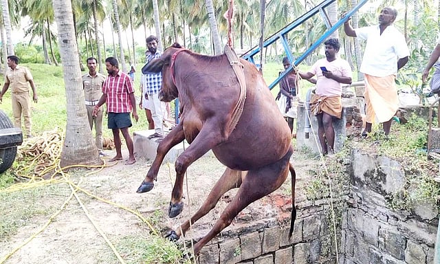 அதன் பின்பு எஸ்காட்ஸ் எந்திரம் கொண்டு வரப்பட்டு மாலை 6 மணிக்கு பசு மாடு மீட்டு வெளியே கொண்டு வரப்பட்டது. தீயணைப்பு துறையினருக்கு நவீன உபகரணங்கள் இல்லாததால்தான் பசு மாடை மீட்பதில் தாமதம் ஏற்பட்டது.