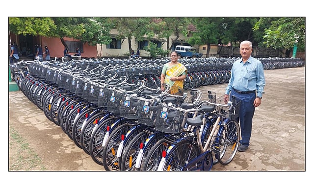 இதனையொட்டி தருமபுரி அரசு அவ்வையார் மகளிர் மேல்நிலைப் பள்ளியில் பிளஸ்-1 முடித்த 698 மாணவிகளுக்கு இலவச சைக்கிள் வழங்குவதற்காக தயார் நிலையில் உள்ளது. இதனைதலைமை ஆசிரியர் தெரேசால், கணேஷ் ஆகியோர் பார்வையிட்டனர்.