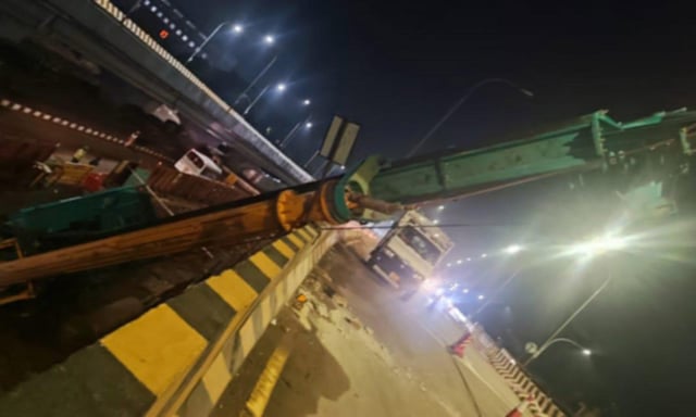 அப்போது ராட்சத கிரேன் திடீரென சாய்ந்து அருகில் உள்ள பாலத்தின் மீது விழுந்தது. இதில் பாலத்தின் பக்கவாட்டு சுவர் லேசாக சேதம் அடைந்தது.