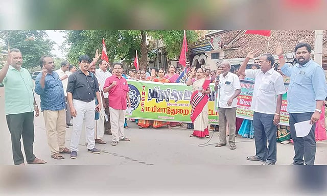 மயிலாடுதுறையில் தமிழ்நாடு அரசு ஊழியர் சங்கத்தினர் கோரிக்கைகளை வலியுறுத்தி பேரணியாக வருவாய் கோட்டாட்சியர் அலுவலகத்திலிருந்து புறப்பட்டு பேரணியாக மாவட்ட ஆட்சியர் அலுவலகம் வரை வந்தனர்.