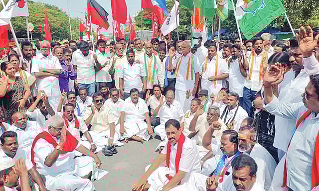 இந்தியா கூட்டணி கட்சிகள் சார்பில் கடலூர் சாலையில் வெங்கடசுப்பா ரெட்டியார் சிலை சதுக்கம் அருகே மறியல் போராட்டம் நடைபெற்றது. தி.மு.க. மாநில அமைப்பாளர் சிவா, காங்கிரஸ் தலைவர் வைத்திலிங்கம் தலைமையில் நடைபெற்ற போராட்டத்தில் நூற்றுக்கணக்கான கூட்டணி கட்சி நிர்வாகிகள், தொண்டர்கள் கலந்து கொண்டு கோரிக்கைகளை வலியுறுத்தி கண்டன கோஷங்களை எழுப்பினர்.