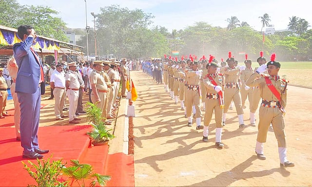 இதை தொடர்ந்து போலீ சார் அணிவகுப்பு மரியாதை திறந்த ஜீப்பில் சென்று பார்வையிட்டார். மூவர்ண கலரிலான பலூனை பறக்க விட்டார். புறாக்களும் பறக்க விடப்பட்டது. பின்னர் போலீசார், ஊர்க்காவல் படை, என்.சி.சி. மாண வர்களின் மரியாதையை ஏற்று கொண்டார்.