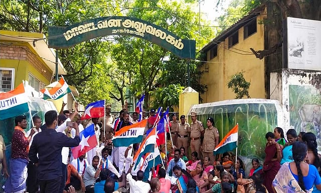 ரப்பர் தோட்ட தொழிலாளர்களுக்கு ஆதரவாக நாகர்கோவில் அண்ணா விளையாட்டு அரங்கம் முன்பு கடந்த 21-ந் தேதி விடுதலை சிறுத்தைகள் கட்சி சார்பில் சாலை மறியல் போராட்டம் நடந்தது. அதன் பின்பும் ரப்பர் தோட்ட தொழிலாளர்களின் போராட்டம் இன்னும் முடிவுக்கு வராத நிலையில் விடுதலை சிறுத்தைகள் கட்சி சார்பில் கடந்த 21-ந் தேதி விடுதலை சிறுத்தைகள் கட்சி சார்பில் சாலை மறியல் போராட்டம் நடந்தது.வலகம் முன்பு இன்று முற்றுகை போராட்டம் நடத்தினர்.இதில் விடுதலை சிறுத்தைகள் கட்சி மாவட்ட செயலாளர் திருமாவேந்தன் தலைமையில் ஏராளமான நிர்வாகிகள் சாலையில் அமர்ந்து போராட்டத்தில் ஈடுபட்டனர்.