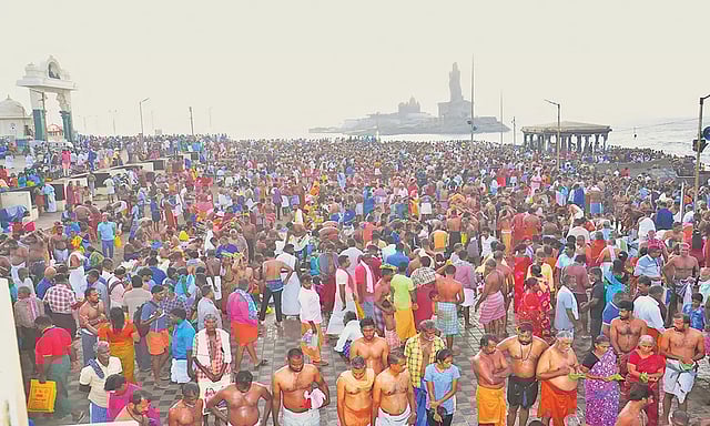 இந்தியாவின் தென்கோடி முனையில் அமைந்துள்ள புண்ணிய தலமான கன்னியாகுமரியில் முக்கடலும் சங்கமிக்கும் திரிவேணி சங்கமத்தில் ஆண்டுதோறும் ஆடி அமாவாசை அன்று ஆயிரக்கணக்கான பக்தர்கள் புனித நீராடி தங்களது முன்னோர்களுக்கு தர்ப்பணம் கொடுப்பார்கள்.