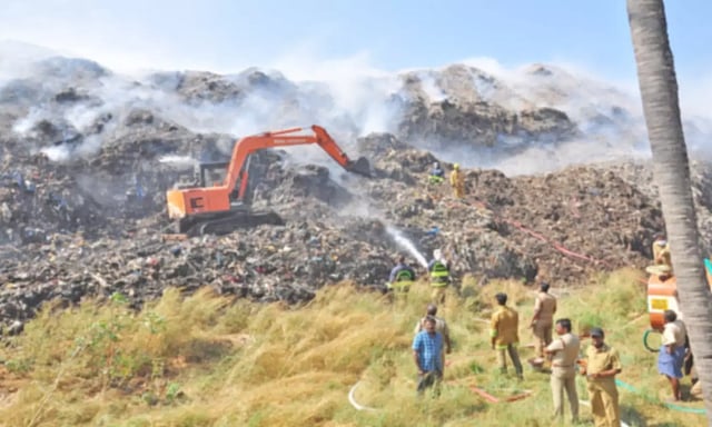 இன்று காலையில் 3-வது நாளாக தீ அணைக்கும் பணி நடந்து வருகிறது. நாகர்கோவில் கன்னியாகுமரி திங்கள் சந்தை பகுதியில் இருந்து தீயணைப்பு வீரர்கள் வரவழைக்கப்பட்டு தீயை அணைக்கும் பணியில் ஈடுபட்டுள்ளனர். ஜே.சி.பி. எந்திரங்கள் மூலமாக குப்பைகள் கிளறப்பட்டு தீயை அணைக்கும் பணி நடந்து வருகிறது. இருப்பினும் தீ எரிந்து கொண்டே உள்ளது. காற்று வேகமாக வீசுவதால் அந்த பகுதி முழுவதும் புகை மண்டலமாக காட்சி அளிக்கிறது.
