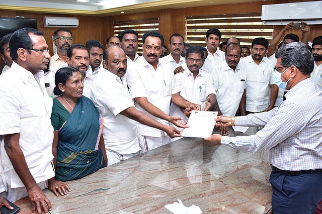 இதுதொடர்பாக முன்னாள் அமைச்சர் எம்.ஆர்.விஜயபாஸ்கர் கட்சியினருடன் மனு அளிக்க கலெக்டர் அலுவலகம் வந்தார். 5 பேரை மட்டுமே அனுமதிக்க முடியும் என போலீஸார் கூறியதை அடுத்து எம்.ஆர்.விஜயபாஸ்கர் வாக்குவாதத்தில் ஈடுபட்டார்.