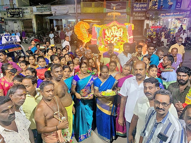 பின்னர் அதைத் தொடர்ந்து தனுஷ்கோடியாபுரம் தெருவில் உள்ள செல்வ விநாயகர் கோவில் முன்பில் இருந்து சீனிவாச பெருமாள் தாயார்களுடன் பல்லக்கில் எழுந்தருளி பக்தர்களுக்கு காட்சியளித்து ஊர்வலமாக மாலை அம்மன் கோவிலுக்கு வந்தடைந்தார். ஊர்வலத்தில் வந்த பக்தர்கள் அனைவரும் மாங்கல்ய பொருள்கள் கையில் ஏந்தி வந்திருந்தனர். அதனைத் தொடர்ந்து அம்பாளுக்கு வளைகாப்பு விழா நடைபெற்றது.