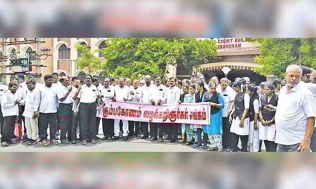 கோர்ட்டுகளில் இ-பை லிங் முறையில் வழக்குகளை தாக்கல் செய்யும் முறையை திரும்ப பெற வேண்டும் என்பதை வலியுறுத்தி கும்பகோணத்தில் வக்கீல்கள் கோர்ட்டை புறக்க ணித்து ஆர்ப்பாட்டத்தில் ஈடுபட்டனர்.