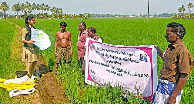 மதுரை மாவட்டம் வாடிப்பட்டி அருகே கட்டக்குளம் ஊராட்சியில், மதுரை வேளாண்மைக் கல்லூரி மாணவிகள், கிராம தங்கல் திட்டஊரக வேளாண்மைப்பணி அனுபவ திட்டத்தின் கீழ் விவசாயிகளுடன் இணைந்து பயிற்சி பெற்று வருகின்றனர். இதில் ஒரு பகுதியாக மாணவி கே.பரிமளா விவசாயிகளுக்கு திருந்திய நெல் சாகுபடி பற்றியும், அதன் பயன்பாடு மற்றும் செயல்முறை பற்றியும் விளக்கம் அளித்தார். இந்த செயல்முறை விளக்கத்தில் விவசாயிகள், கிராம பொதுமக்கள் கலந்து கொண்டனர்.
