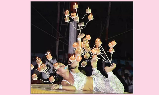 மணிப்பூர் மாநில கலை ஞர்கள் பங்கேற்கும் கத்தி மேல் சாகசங்கள், பிரமிப் பூட்டும் ரோப் பேலன்ஸ், மிகச்சிறிய சைக்கிள் சாகசங் கள், கொல்கத்தா அழகிக ளின் துப்பாக்கி சூட்டிங், மகாராஷ்டிரா அழகிகளின் குரூப் டெண்டல் பேலன்சிங், 8 அழகிகள் பங்கேற்கும் சாகசங்கள், பிரமிப்பூட்டும் அதிபயங்கர பயர் டான்ஸ், மணிப்பூர் கலைஞர்களின் சேர் பேலன்ஸ் என எண் ணற்ற சாசக நிகழ்ச்சிகளை கண்டுகளிக்க குடும்பத்தின ருடன் வருகை தாருங்கள்.