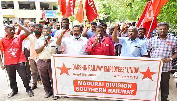 மதுரை ரெயில் நிலைய மேற்கு நுழைவுவாயில் முன்பு இன்று டி.ஆர்.இ.யூ.-சி.ஐ.டி.யூ. ரெயில்வே தொழிற்சங்கங்கள் சார்பில் ஆர்ப்பாட்டம் நடைபெற்றது.