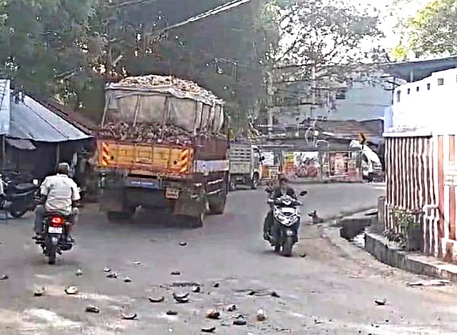 இதனால் தென்னை மட்டைகளை.ஏற்றி செல்லும் வாகன உரிமையாளர்களிடம் தேங்காய் குடோன் உரிமையாளர்கள் உரிய ஆலோசனைகள் வழங்கி பாதுகாப்பான முறையில் கொண்டு செல்ல அறிவுறுத்த வேண்டுமென பொதுமக்கள் மற்றும் சமூக ஆர்வலர்கள் கேட்டுக் கொண்டுள்ளனர்.