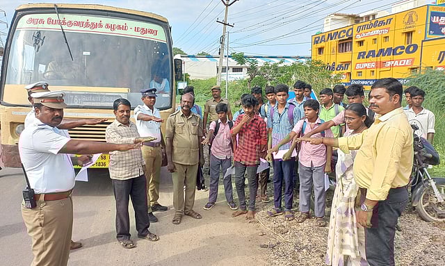 அவனியாபுரம் பெரியார் சிலை முன்பு போக்குவரத்து காவல்துறை ஆய்வாளர் தங்கபாண்டியன், பஸ் படிக்கட்டில் பயணம் செய்த மாணவர்களுக்கு அறிவுரை வழங்கி விழிப்புணர்வு உறுதிமொழியை ஏற்க வைத்தார். இதில் ஆர்.டி.ஓ. சித்ரா, திருப்பரங்குன்றம் போக்குவரத்து இன்ஸ்பெக்டர் பூர்ணா கிருஷ்ணன், போக்குவரத்து கழக கிளை மேலாளர் முத்துமணி, உதவி பொறியாளர் கண்ணன், இன்ஸ்பெக்டர் இளங்கோவன், போக்குவரத்து சிறப்பு சார்பு ஆய்வாளர் செல்வம், காவலர்கள் அழகு முருகன், சதீஷ் உள்பட பலர் கலந்து கொண்டனர்.
