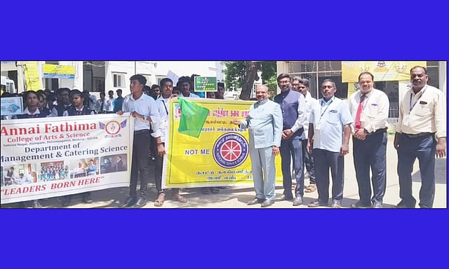 பேரணி ஏற்பாட்டை ஓட்டல் மேனேஜ்மென்ட் துறை தலைவர் பால்ராஜ், நாட்டு நலப்பணித்திட்ட அலுவலர் முனைவர் முனி யாண்டி, பேராசிரியர் கள் செந்தில், அருண், கங்கா தரன், சிங்கராஜா, சீமாட்டி, உடற்கல்வி இயக்குனர் செந்தில்குமார், சிஸ்டம் என்ஜினீயர் உதய கதிரவன் உள்ளிட்டோர் செய்தனர். திருமங்கலம் ராஜாஜி சிலை அருகில் ஆரம்பித்து தாலுகா அலுவலகம் அருகில் நிறைவுற்ற பேரணியில் 300-க்கும் மேற்பட்ட மாணவ, மாணவிகள் கலந்து கொண்டனர்.