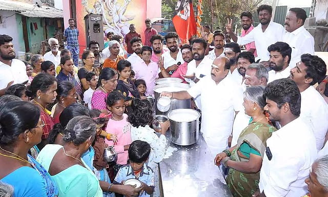 திருப்பூர் மாநகர் மாவட்ட எம்.ஜி.ஆர். இளைஞர் அணி செயலாளரும், முன்னாள் எம்.எல்.ஏ.வுமான சு.குணசேகரன் ஆண்டுதோறும் முன்னாள் முதலமைச்சர் எம்.ஜி.ஆர். பிறந்த நாளில் 2 ஆயிரம் குடும்பங்களுக்கு பால் மற்றும் அன்னதானம் வழங்கி வருகிறார். அதேபோல் இந்த ஆண்டும் எம்.ஜி.ஆரின் 106 வது பிறந்த நாளையொட்டி திருப்பூர் தெற்கு தொகுதிக்குட்பட்ட வாலிபாளையம், கே.பி.என். காலனி, பெரியார் காலனி உள்ளிட்ட பகுதிகளில் சுமார் 2000 குடும்பங்களுக்கு ஆயிரம் லிட்டர் பால், மற்றும் அன்னதானம் வழங்கி கொண்டாடினர். நிகழ்ச்சியில் கிளைச் செயலாளர் முத்து அவிநாசி அப்பன், நிர்வாகிகள் வெங்கிடு, ராகவன், சிவகுமார், சின்னத்தம்பி, உள்ளிட்ட ஏராளமானவர் கலந்து கொண்டனர்.