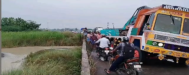 கடலூர் மாவட்டம் சேத்தியாத்தோப்பில் இருந்து இட்டாச்சி வாகனத்தை ஏற்றிக் கொண்டு டிரெய்லர் லாரி இன்று காலை பண்ருட்டிக்கு புறப்பட்டது. இந்த லாரி சென்னை - கும்பகோணம் - தஞ்சாவூர் தேசிய நெடுஞ்சாலையில் வடலூர் அருகே உள்ள மருவாய் பரவனாற்று பாலத்தின் மீது இன்று காலை 11 மணியளவில் வந்தது.அப்போது பாலத்தில் இருந்த வேகத்தடை மீது ஏறி இறங்கிய டிரெய்லர் லாரி சாலையிலிருந்த பள்ளத்தில் விழுந்தது. இதில் டிரெய்லர் லாரியில் ஏற்றி வந்த இட்டாச்சி வாகனம், லாரியிலிருந்து துள்ளி குதித்து அந்தரத்தில் தொங்கியது.