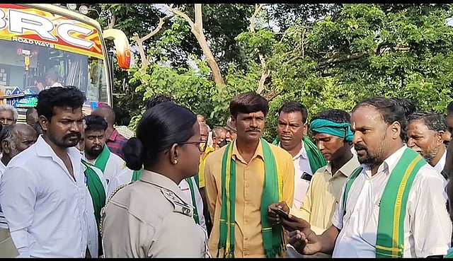 இருந்தபோதும் போலீசார் அனுமதி மறுத்ததால் ஆத்திரமடைந்த விவசாயிகள் கரும்பு மற்றும் நெற்பயிர்களை கையில் பிடித்தபடி சாலை மறியலில் ஈடுபட்டனர். மறியல் காரணமாக சென்னை - திருச்சி தேசிய நெடுஞ்சாலையில் போக்குவரத்து பாதிப்பு ஏற்பட்டது. மறியல் ஈடுபட்ட விவசா யிகளிடம் பேச்சுவார்த்தை நடத்திய போலீசார், சென்னை போராட்ட த்திற்கு செல்ல அனுமதி அளித்த னர். தொடர்ந்து விவசாயி கள் தங்கள் மறியலை கைவி ட்டனர். விவசாயி களின் இந்த மறியல் காரணமாக சென்னை - திருச்சி தேசிய நெடுஞ்சா லையில் அரை மணி நேரம் போக்குவரத்து பாதிப்பு ஏற்பட்டது.