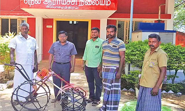 தமிழ்நாடு வேளாண்மைப் பல்கலைக்கழகத்தின் கீழ் இயங்கும் அம்பை நெல் ஆராய்ச்சி நிலையத்தின் இணை பேராசிரியர் மற்றும் தலைவர் சரவணன் நெல் வரிசை நடவு வயல்களில் எந்திரம் மூலம் களை எடுப்பதால் வேலை ஆட்களின் தேவை குறையும்.