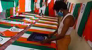 இதில் புதுக்கோட்டை பிருந்தாவனம் அருகில் கடந்த 40 ஆண்டுகளாக பரம்பரை பரம்பரையாக கதர் துணியில் தேசியக்கொடி தயாரிக்கும் பணியில் ஈடுபட்டுள்ள குமார் என்பவர் தேசியக்கொடி தயாரிக்கும் பணியில் மும்முரமாக ஈடுபட்டு வருகிறார். பிளாஸ்டிக்கில் ஆன தேசியக்கொடி பயன்படுத்தக் கூடாது என்று ஏற்கனவே அரசு உத்தரவிட்டதை தொடர்ந்து கதர் மற்றும் பாலிஸ்டர் துணியில் தேசியக்கொடி தயாரிக்கும் பணி இந்த ஆண்டு நடைபெற்று வருகிறது. மேலும் மத்திய, மாநில அரசுகள் அனைத்து வீடுகளிலும் தேசியக்கொடி ஏற்றுவதற்கு நடவடிக்கை எடுத்து வருவதால் இந்த ஆண்டு தேசியக்கொடி அதிக அளவில் ஆர்டர் வந்துள்ளது. 3 விதங்களில் தயாரிக்கப்படும் தேசிய கொடி ரூ.100 மற்றும் ரூ.120-க்கு விற்பனை செய்யப்பட்டு வருகிறது.