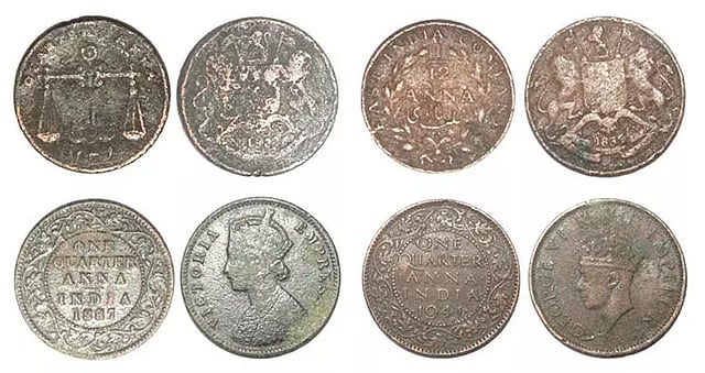 மற்றொன்று கி.பி.1887-ம் ஆண்டு விக்டோரியா மகாராணி காலத்தில் வெளியிடப்பட்டது. ¼ அணா மதிப்புள்ளது. ஒரு கால் அணா இந்தியா 1887 என ஆங்கிலத்தில் 5 வரிகளில் எழுதப்பட்டு உள்ளது. நாணயத்தின் பின்புறம் விக்டோரியா எம்பரஸ் என எழுதப்பட்டு அவரின் மார்பளவு படமும் உள்ளது.