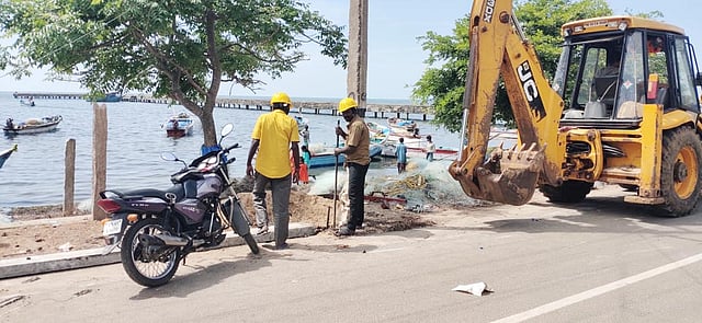 இதனால் அசம்பாவி தங்கள் ஏற்ப டுவதை தடுக்கும் வகையில் தொண்டி மின்வாரிய அதிகாரிகளுடன் 4 மின் உதவி பொறியாளர்கள், 3 மின்பாதை ஆய்வாளர்கள், 2 சிறப்பு நிலை முகவர்கள், 52 கேங் மேன்கள், மதுரை மாவட்டம் விரகனூர், பனையூர், பெருங்குடி, கீழையூர் ஆகிய பகுதிகளி லிருந்து வந்து தொண்டியில் சீரமைப்பு பணிகளில் ஈடுபட்டு வருகின்றனர்.