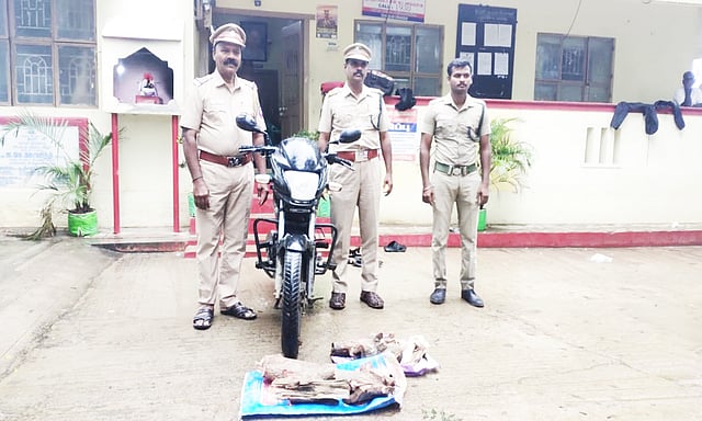 அப்போது சுமார் 5 கிலோ எடை கொண்ட சந்தன கட்டைகள் இருப்பது தெரியவந்தது. மோட்டார் சைக்கிள் மற்றும் சந்தன கட்டை களை போலீசார் பறிமுதல் செய்தனர்.
