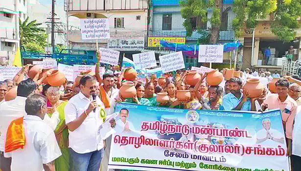 சேலம் மாவட்ட மண்பாண்ட தொழிலாளர்கள் மண்பானை மற்றும் மண் அடுப்புகளுடன் சேலம் கோட்டையில் திரண்டு ஆர்ப்பாட்டத்தில் ஈடுபட்டனர்.
