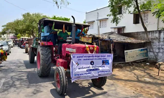 தருமபுரி மாவட்டம், பென்னாகரத்தில் பாராளுமன்ற பொது தேர்தலை முன்னிட்டு வாக்காளர்கள் 100 சதவிகிதம் வாக்களிப்பது குறித்து பொது மக்களிடம் விழிப்புணர்வு ஏற்படுத்த டிராக்டர் பேரணி தனி மாவட்ட வருவாய் அலுவலர் பூங்கோதை தலைமையில் நடைபெற்றது.