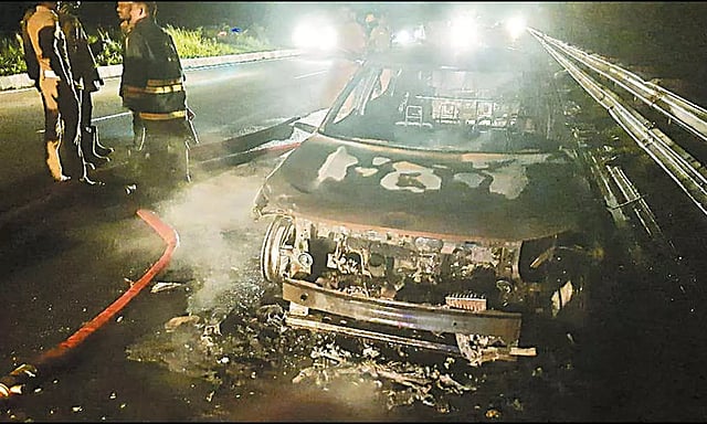 இதை பார்த்ததும் காரை சாலை ஓரமாக நிறுத்திவிட்டு இருவரும் இறங்கினர். அதற்குள் காரின் முன் பகுதி தீப்பிடித்து மளமளவென எரிய ஆரம்பித்தது. இதனால் அதிர்ச்சி அடைந்த இருவரும் தீயை அணைக்க போராடினார்கள்.
