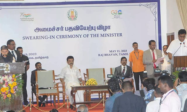இன்று (வியாழக்கிழமை) காலை 10.30 மணிக்கு புதிய அமைச்சர் பதவியேற்பு விழா கவர்னர் மாளிகையில் நடந்தது. முதலமைச்சர் மு.க.ஸ்டாலின் கவர்னர் மாளிகைக்கு 10.23 மணிக்கு வருகை தந்தார். அவருக்கு பேண்டு வாத்தியம் முழங்க வரவேற்பு அளிக்கப்பட்டது.