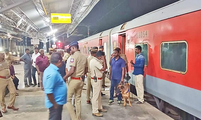 முத்துநகர் எக்ஸ்பிரஸ் ரெயிலில் ஒவ்வொரு பெட்டியாக சோதனை நடத்தினர். இந்த சோதனை காரணமாக இரவு 8.15 மணிக்கு புறப்பட வேண்டிய அந்த ரெயில் தாமதமாக 8.45 மணிக்கு புறப்பட்டது.