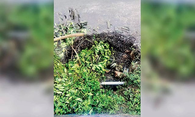 இந்த சாலையில் கடந்த சில மாதங்களுக்கு முன்பு பாலத்தின் நடுவே போடப்பட்ட சிமெண்ட் குழாய் உடைந்து பள்ளம் உருவானது.