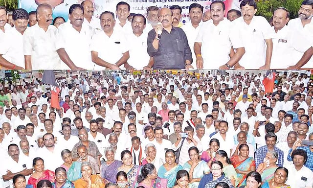 ஆர்ப்பாட்டத்துக்கு விஜயகுமார் எம்.எல்.ஏ., எம்.எஸ்.எம்.ஆனந்தன் எம்.எல்.ஏ., முன்னாள் எம்.பி. சிவசாமி, முன்னாள் எம்.எல்.ஏ.க்கள் பழனிசாமி, என்.எஸ்.என்.நடராஜ், மாநகராட்சி எதிர்க்கட்சி தலைவர் அன்பகம் திருப்பதி, அம்மா பேரவை மாநில இணை செயலாளர் முத்து வெங்கடேஸ்வரன், பொதுக்குழு உறுப்பினர் தம்பி மனோகரன், பகுதி செயலாளர்கள் திலகர்நகர் சுப்பு, மகேஷ்ராம், அண்ணா தொழிற்சங்க செயலாளர் கண்ணபிரான், அம்மா பேரவை மாவட்ட தலைவர் அட்லஸ் லோகநாதன், வர்த்தக அணி செயலாளர் எஸ்.பி.என்.பழனிசாமி, அமைப்புசாரா ஓட்டுனர் அணி செயலாளர் மார்க்கெட் சக்திவேல் உள்பட திரளானவர்கள் கலந்து கொண்டனர்.