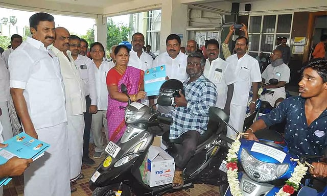 திருப்பூர் மாவட்ட கலெக்டர் அலுவலக கூட்டரங்கில் மாற்றுத்திறனாளிகள் நலத்துறையின் சார்பில் மாற்றுத்திறனாளிகளுக்கு ரூ.27.64 லட்சம் மதிப்பீட்டில் இணைப்பு சக்கரம் பொருத்திய பெட்ரோல் ஸ்கூட்டர் மற்றும் கைபேசிகள் வழங்கும் நிகழ்ச்சி நடைபெற்றது. இதில் அமைச்சர்கள் மு.பெ.சாமிநாதன், கயல்விழி செல்வராஜ் ஆகியோர் கலந்து கொண்டு வழங்கினர்.