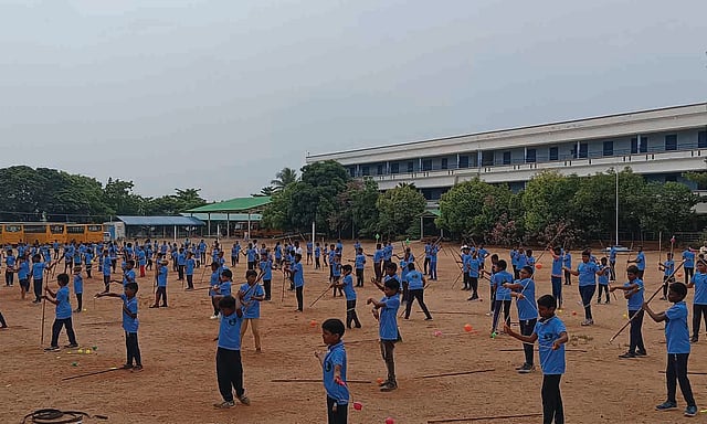 திருப்பூர் இடுவம்பாளை யம் பகுதியில் உள்ள தனியார் பள்ளியில் பல்வேறு சிலம்பாட்ட கழகங்கள் சார்பில், நோபல் உலக சாதனை முயற்சிக்காக 235 பள்ளி மாணவ&மாணவிகள் தொடர்ச்சியாக 5 மணி நேரம், இடைவெளியின்றி சிலம்பம் சுற்றினர்.