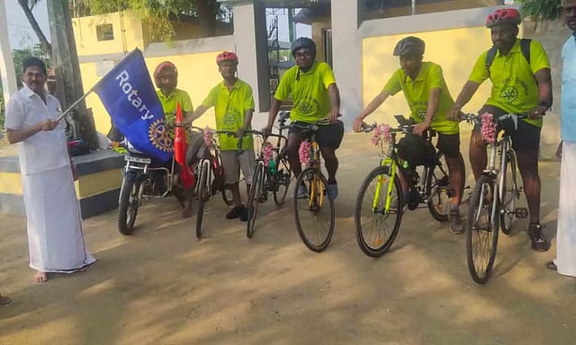 ரோட்டரி செயலாளர் சுந்தர்ராஜன், அனைவரையும் வரவேற்றார். இந்த சைக்கிள் பயணத்தில், ராமஜெயம்(70) ,ரங்கசாமி (63) ,மகேஷ்(30) ,தரணி(19) ,ஆகிய 4 பேர் பல்லடம் அருகே உள்ள சித்தம்பலம் கிராமத்தில் இருந்து, திருச்செந்தூர் நோக்கி நேற்று புறப்பட்ட னர்.