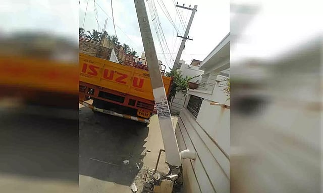 இதையடுத்து சம்பவ இடத்திற்கு வந்த மின்வாரிய அதிகாரிகள், அந்த பகுதியில் மின்சாரத்தை நிறுத்தி, ஊழியர்கள் மூலம் மின்கம்பத்தை மாற்றி அமைத்து சரி செய்தனர். இதனால் மங்கலம் ரோடு பகுதியில் சுமார் 2 மணி நேரத்திற்கு மேலாக மின்தடை ஏற்பட்டது. கோடை வெயிலால் ஏற்கனவே அவதியில் இருந்த மக்கள், மின்தடையால் மேலும் அவதிப்பட்டனர்.